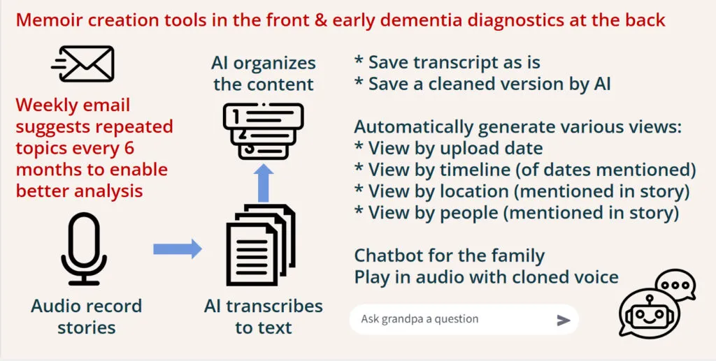 MemoirEase guides seniors with caregivers through short weekly storytelling activities. These recordings are analyzed using an AI engine that detects changes in language, narrative structure, and vocal biomarkers associated with early cognitive changes – while simultaneously building an engaging digital memoir that strengthens family and social connections.